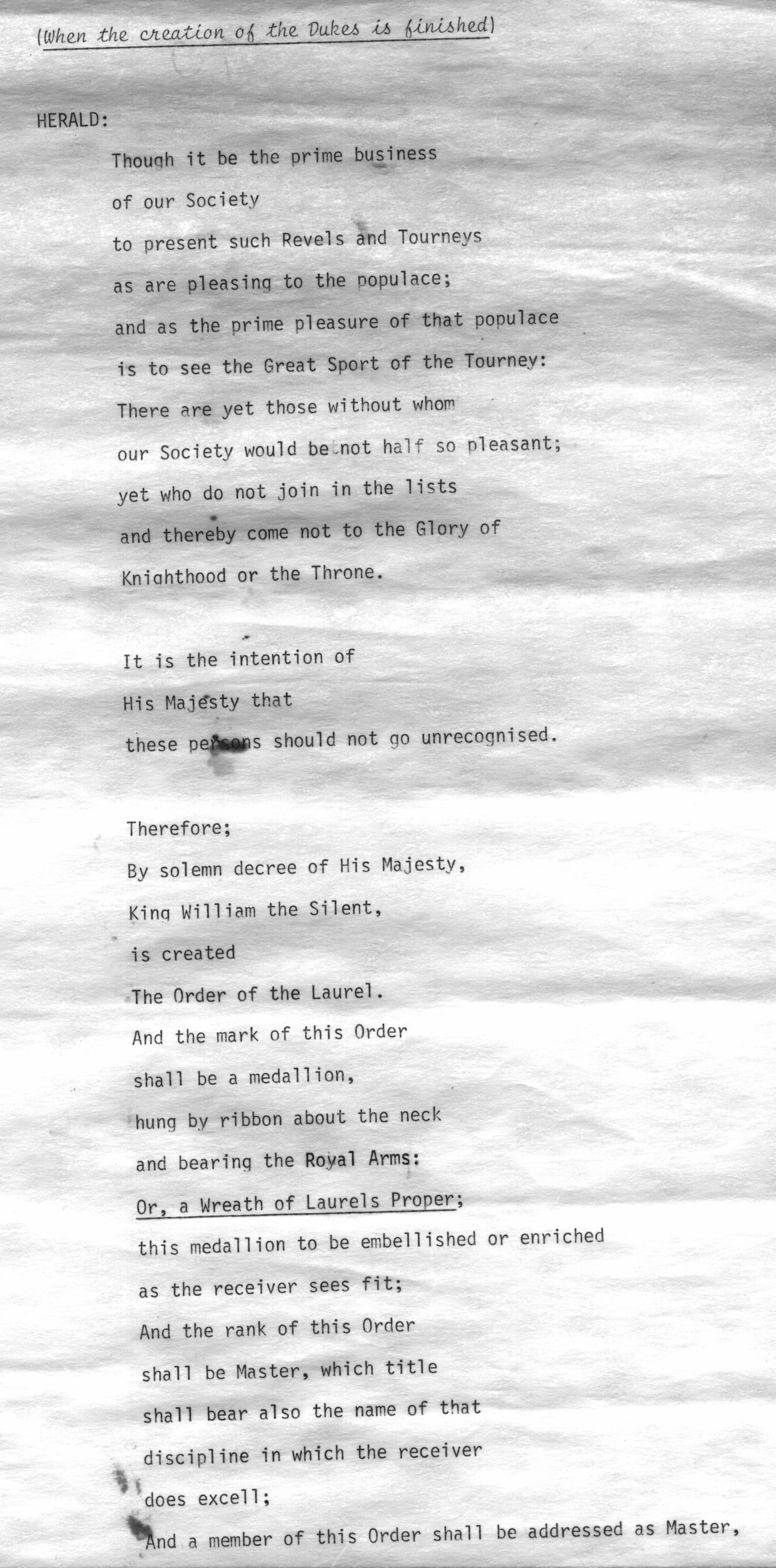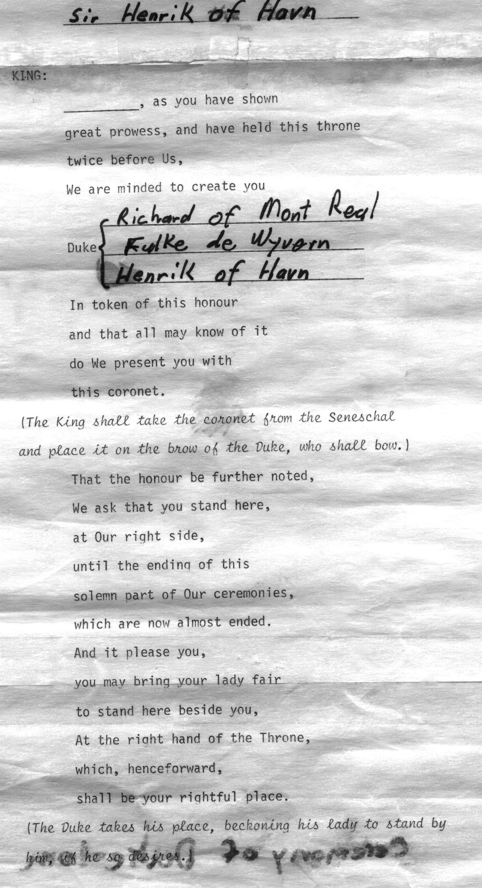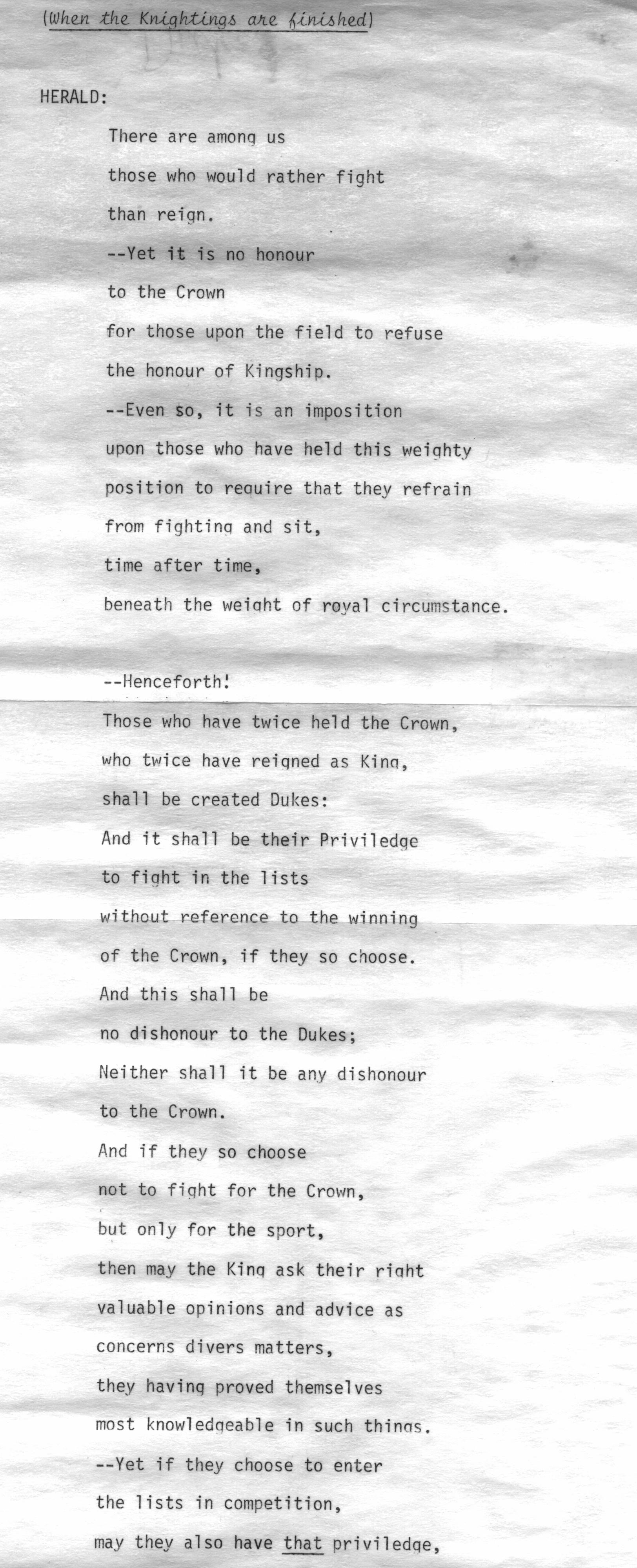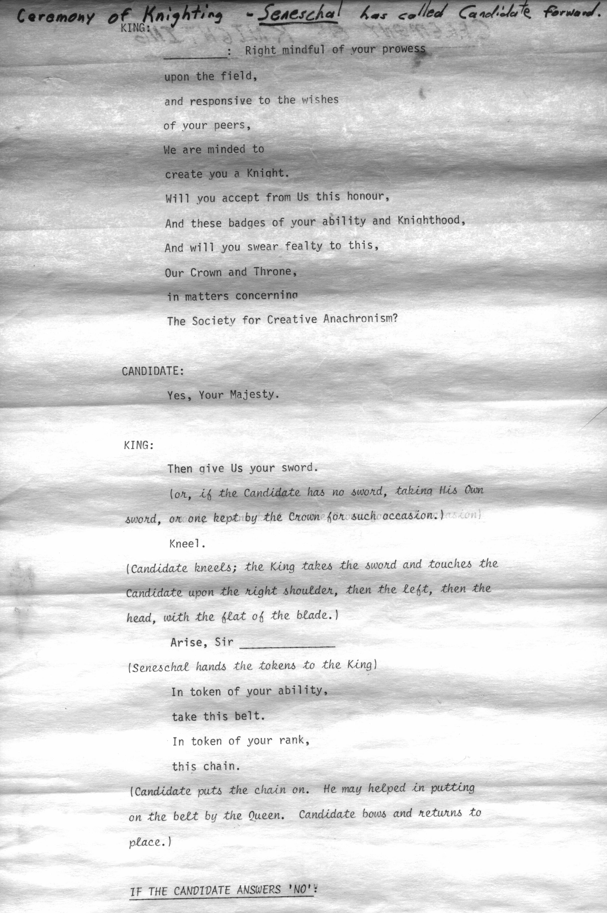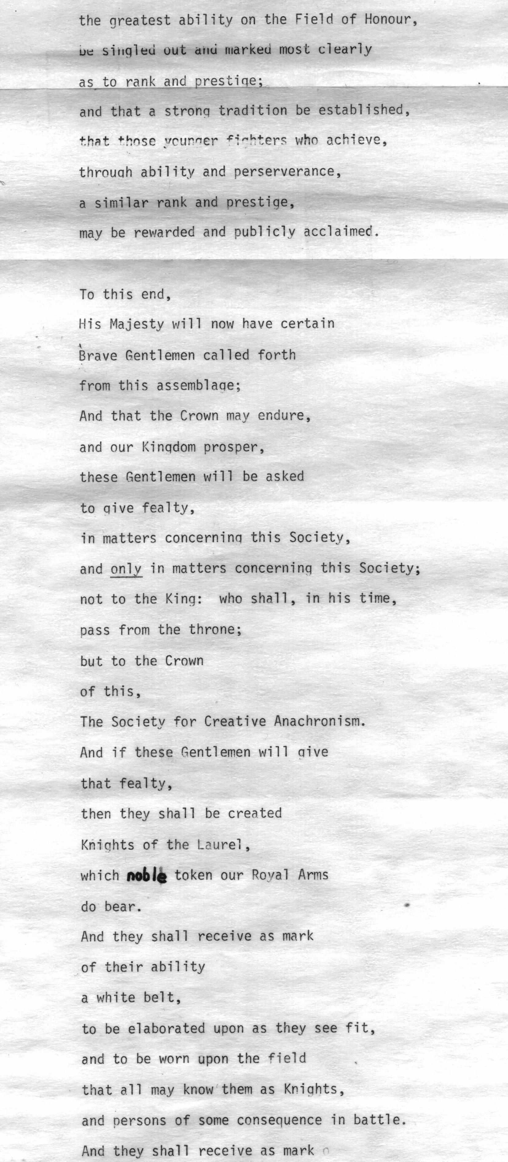 I've been asked many times why I had possession of the 12th Night Roll of AS 2. What happened is this: when Alison von Markheim was Vesper Principle Herald of the West and I was Banner Herald, one of Vesper's deputies, she gave me a small box inside of which were the surviving pieces of the 12th Night Roll plus a second roll that was a slightly later version of just the knighting ceremony. We unearthed them while I was helping Alison with straightening up the Vesper files one afternoon. The reason I took these home with me was to make a transcription of the text, something Alison was sure had never been done. A first partial version of this transcription was posted to the Rialto in 1991.