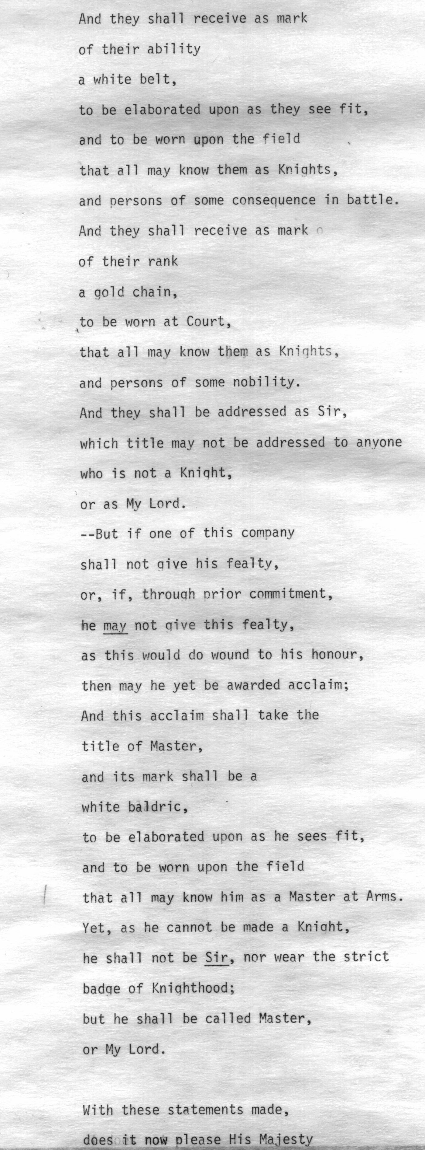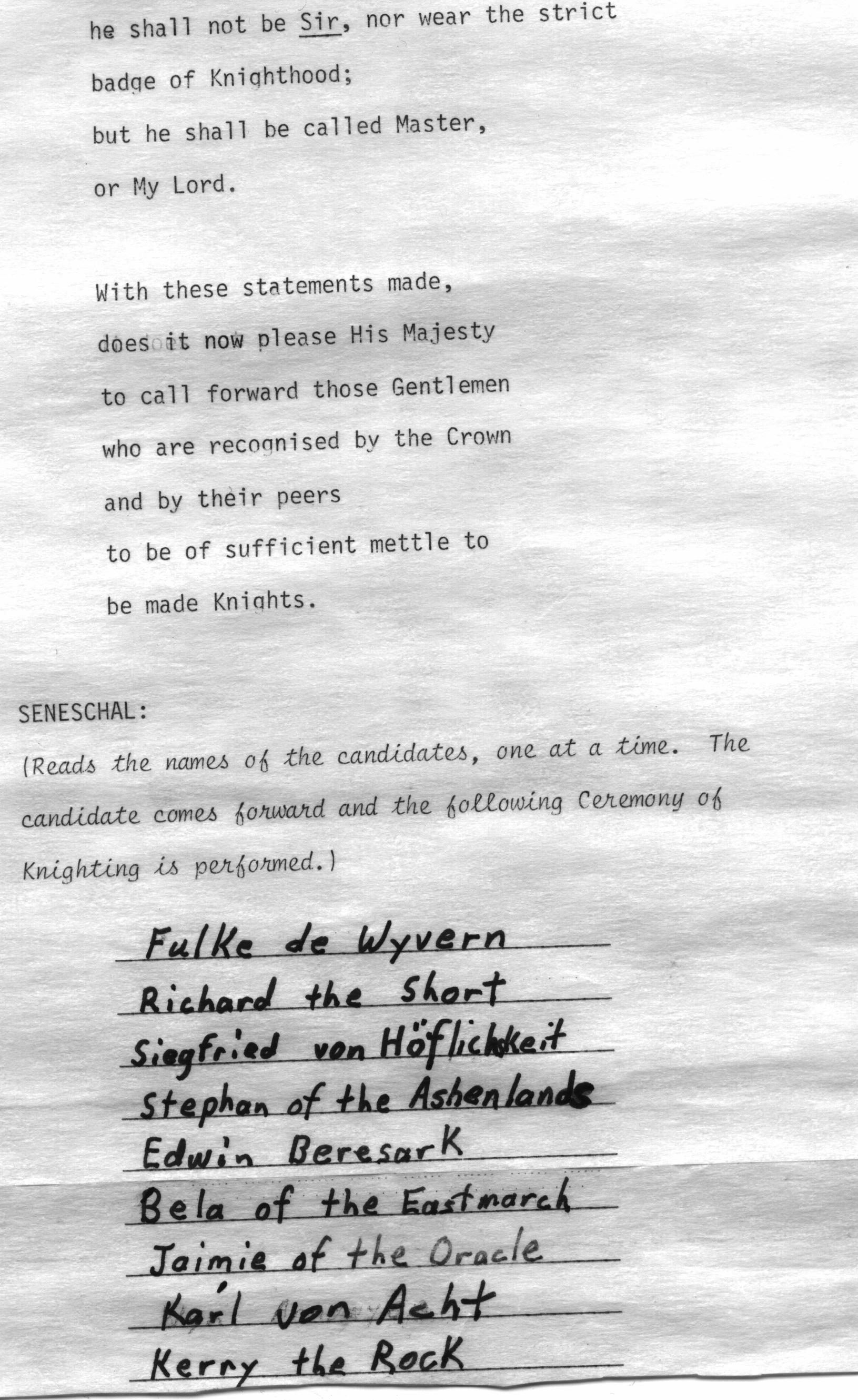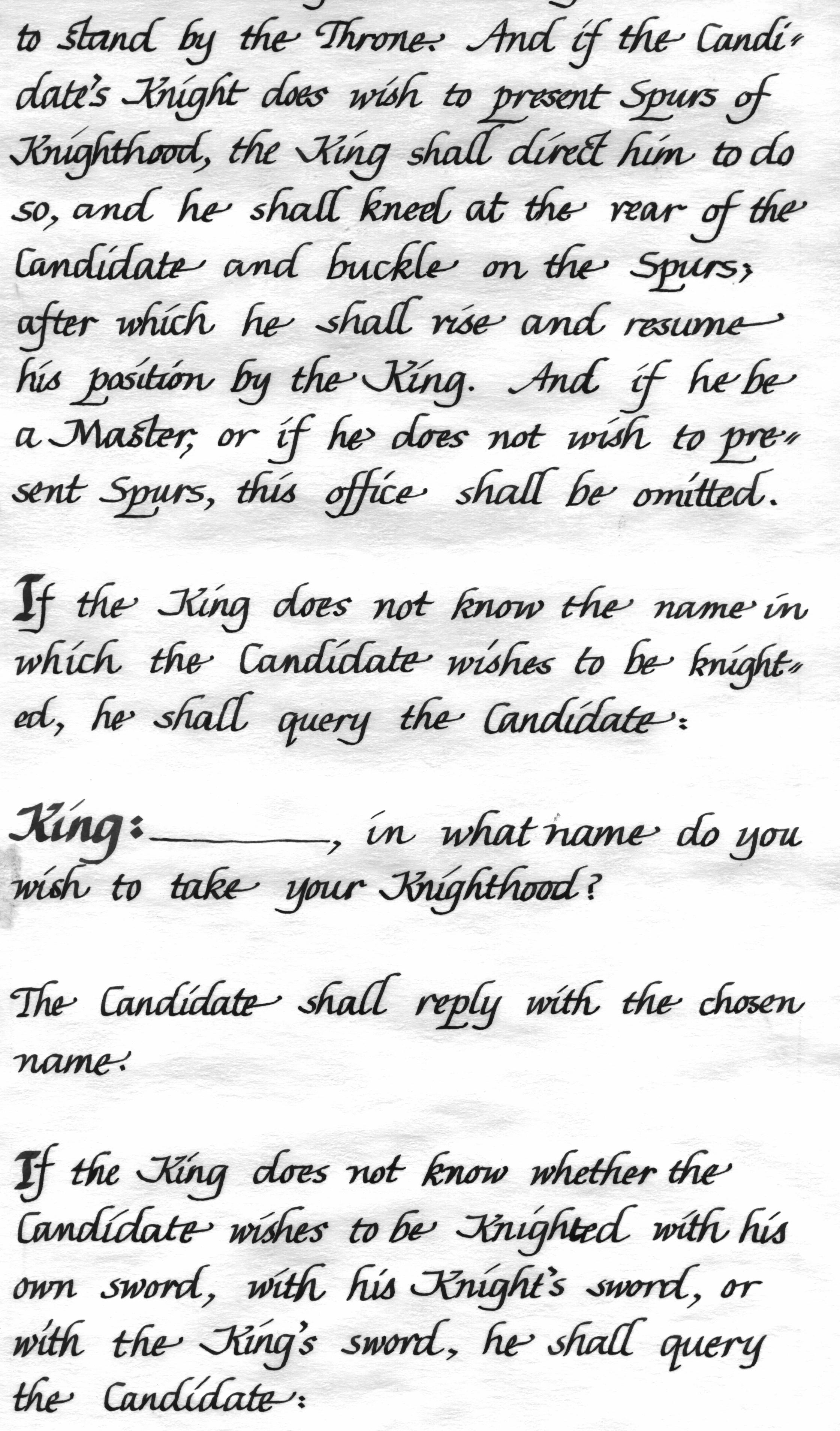 At some point, the 12th Night Roll was retired from being used as the ceremony script for laurels, dukes and knights. In the case of the knights, some one calligraphed the Knighting Roll to replace the 12th Night Roll as the ceremony script. My scan of the Knighting Roll follows the scan of the 12th Night Roll below. I do not have any sort of date for the Knighting Roll, though I suspect that is was made within a year or two of the 12th Night Roll.