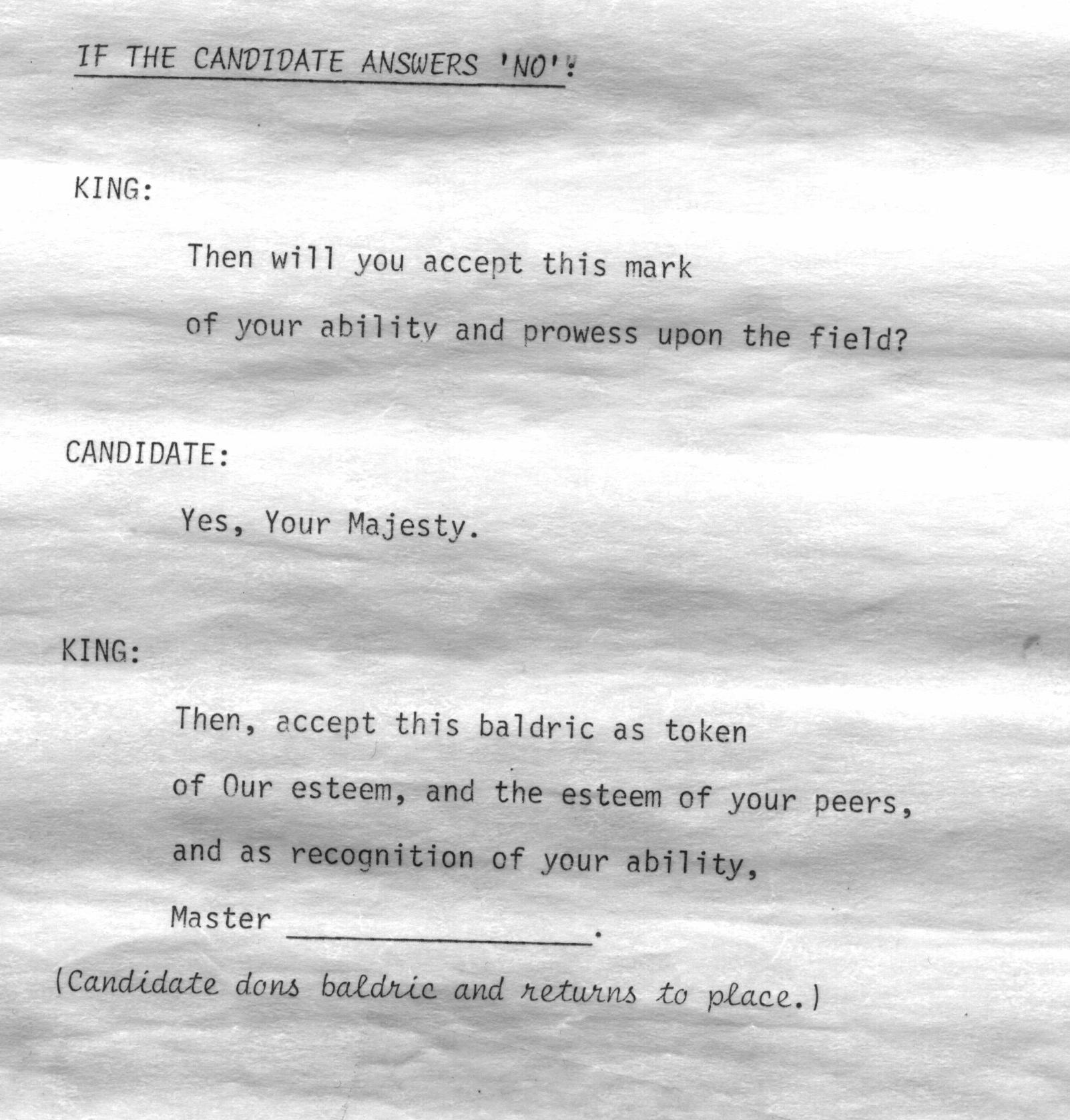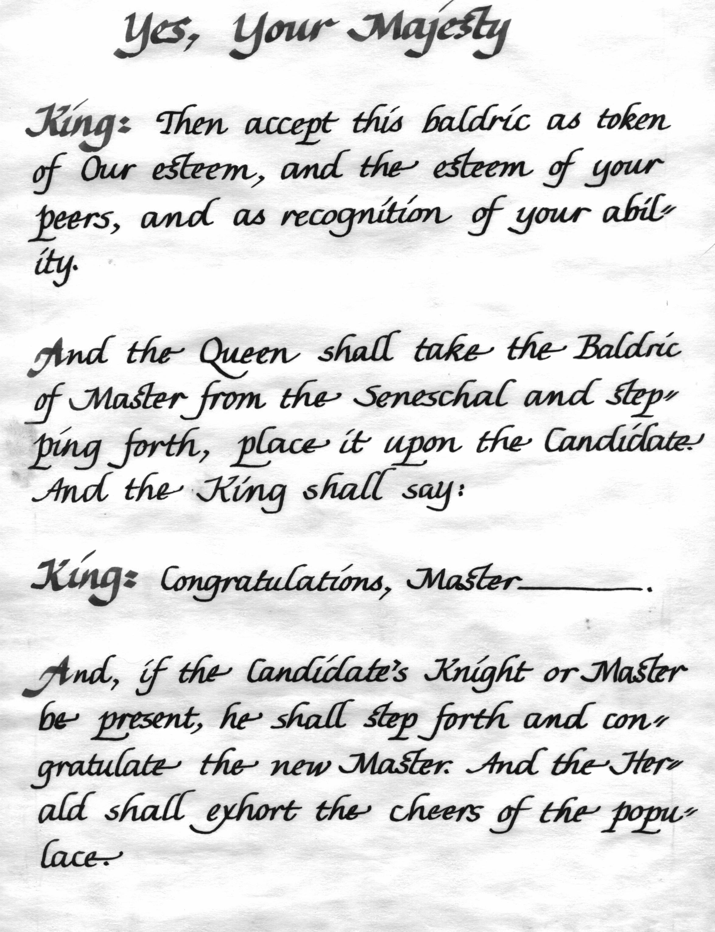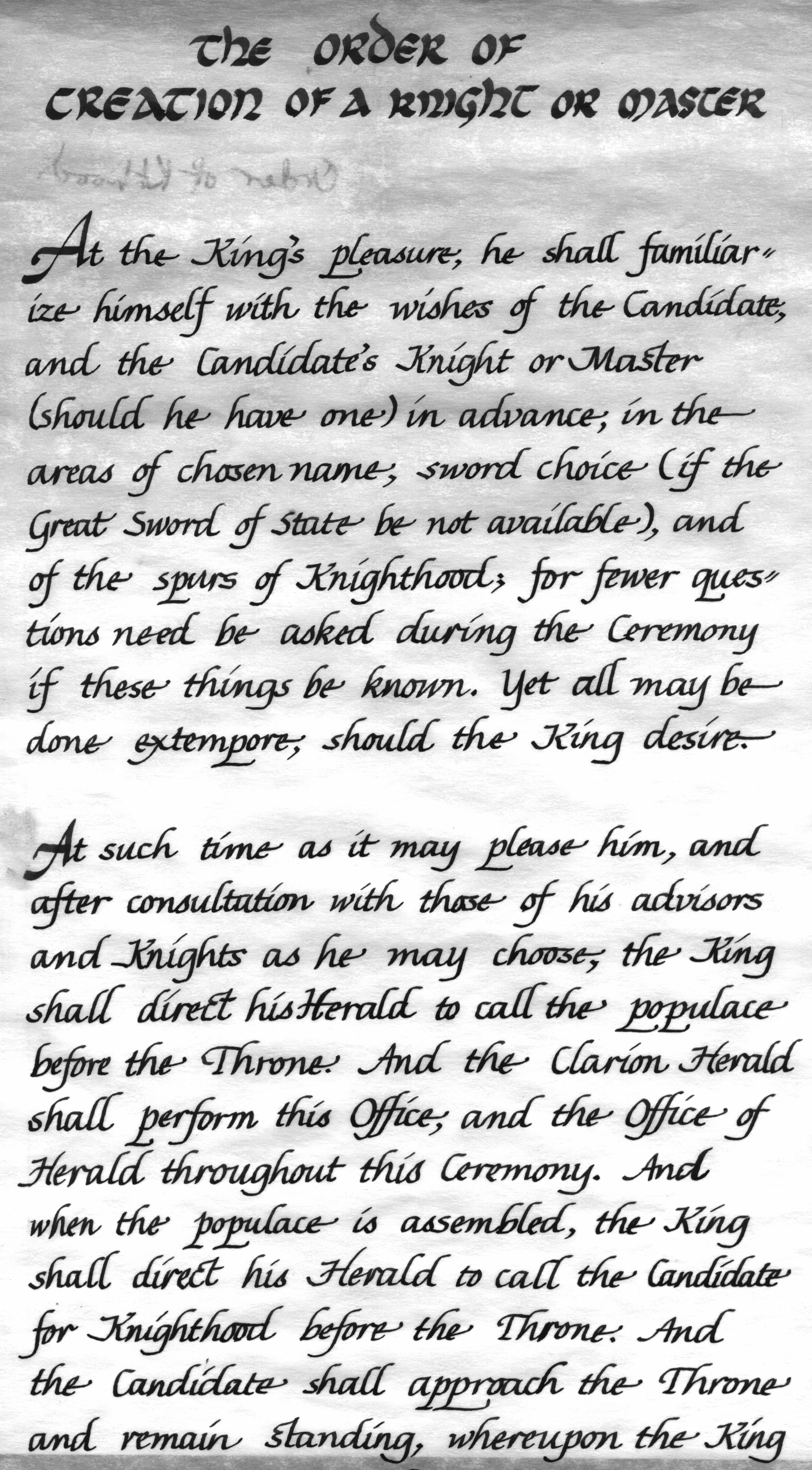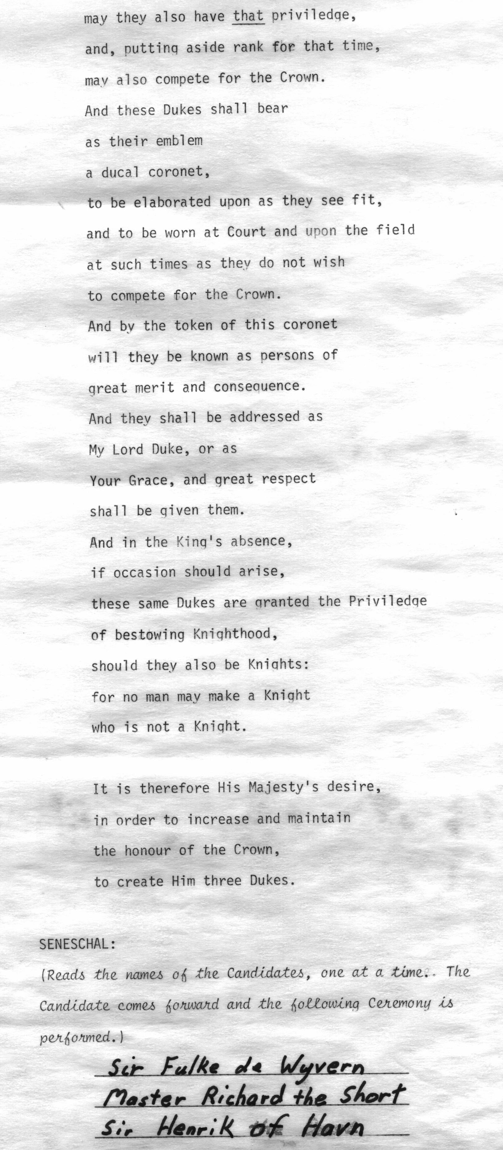 At some point, the 12th Night Roll was retired from being used as the ceremony script for laurels, dukes and knights. In the case of the knights, some one calligraphed the Knighting Roll to replace the 12th Night Roll as the ceremony script. My scan of the Knighting Roll follows the scan of the 12th Night Roll below. I do not have any sort of date for the Knighting Roll, though I suspect that is was made within a year or two of the 12th Night Roll.