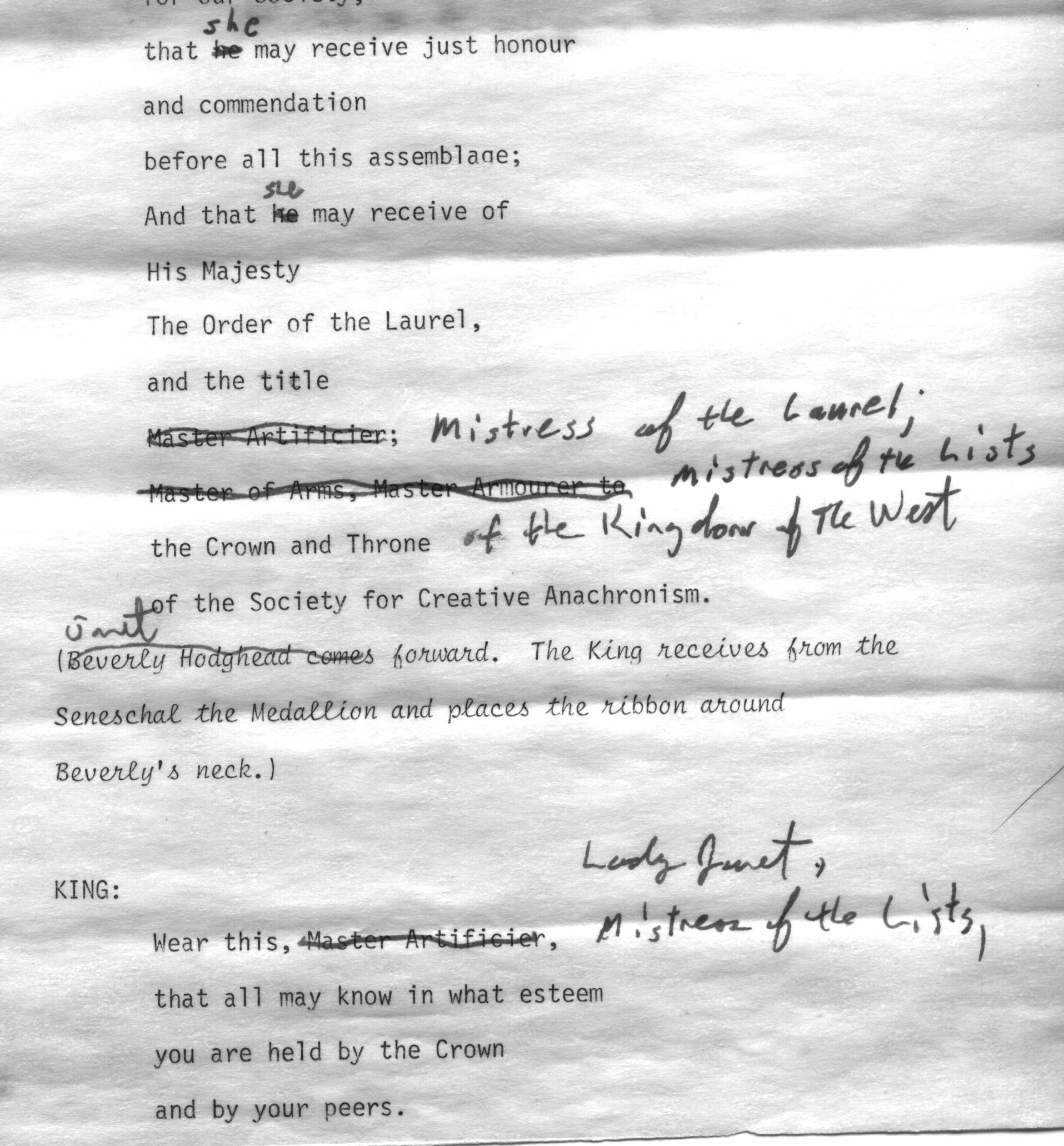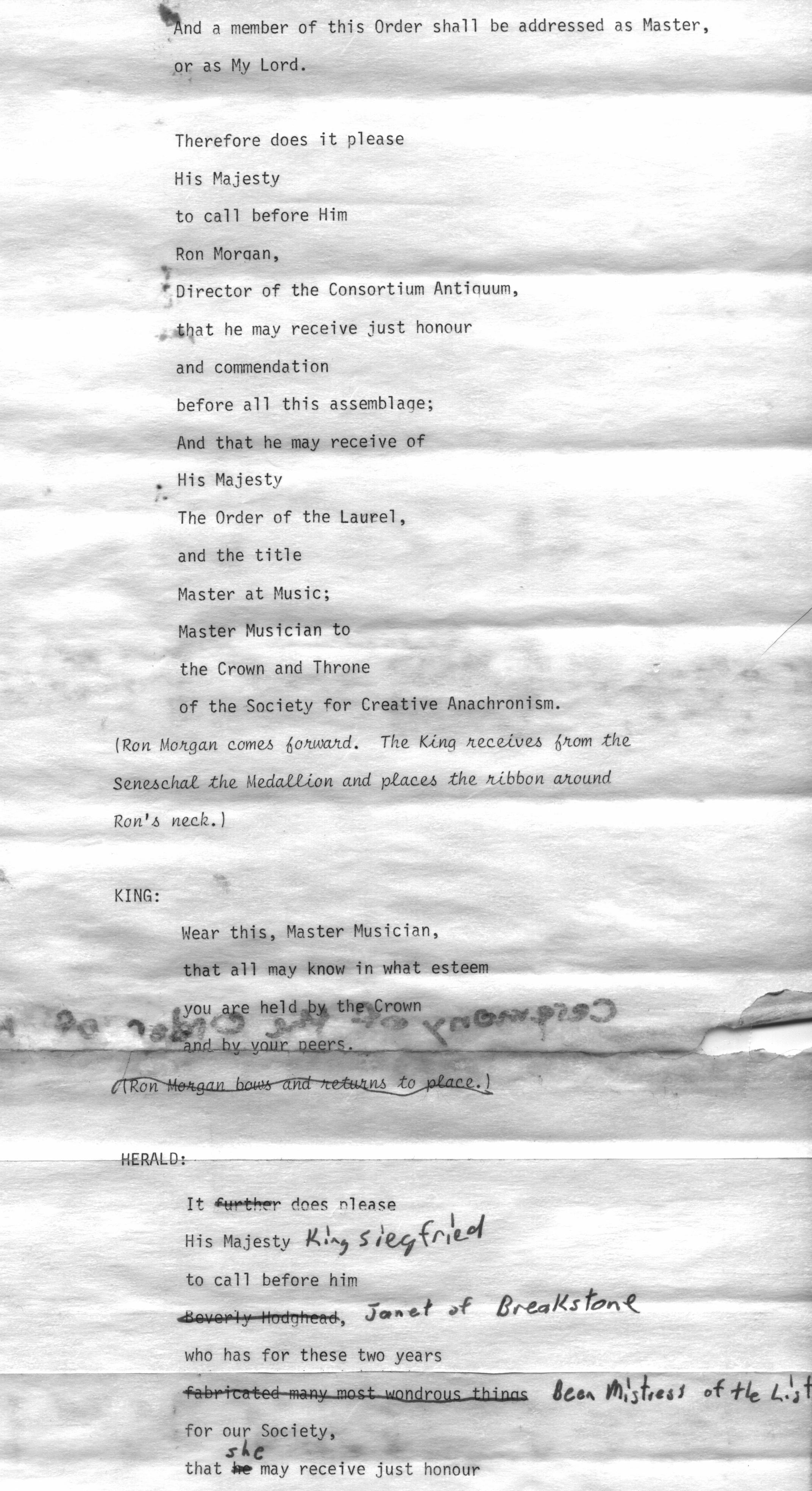 This document was originally constructed as one continuous scroll to be read by the herald during court. After 12th Night, the 12th Night Roll was sometimes used as the script for knighting and laurelling ceremonies, where the names of previous recipients were crossed out and new names written in. You will see evidence of this on the roll fragments themselves. A transcription (which I'm pretty sure is the one that Thyri and I made, used without attribution) and the history of the construction of the 12th Night Roll can be found on the West Kingdom History website.