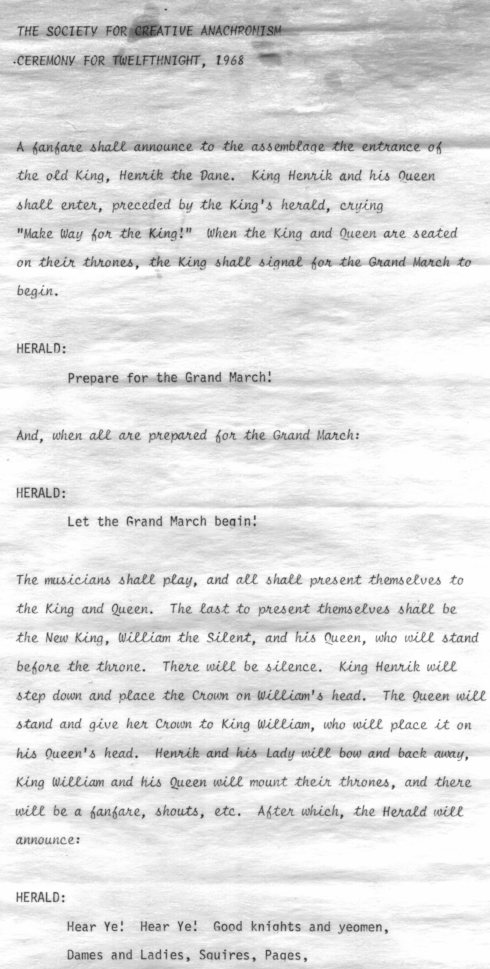 Below you will find scans of the 12th Night Roll used as the script for the court ceremonies at the 2nd SCA 12th Night held on January 6, 1968. Essentially, having made a transcription of the 12th Night Roll, I thought it was a good idea to make a scan of the document for posterity, 1) so people could still look at it, despite the fact that its real home is a filing cabinet belonging to the Vesper Principle Herald's office, and 2) if it were damaged or destroyed, then there would be at least these scans preserving its image.