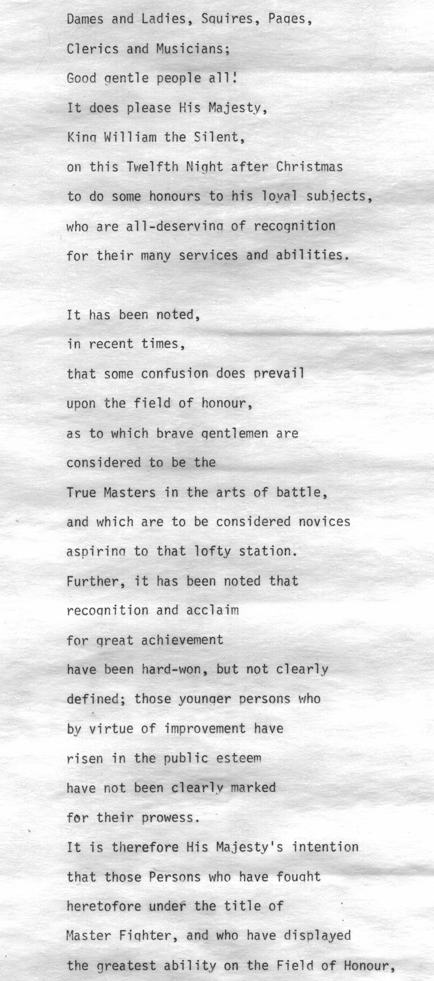 This event was the second 12th Night held in the Society. My 2002 TI article on scrolls is incorrect in asserting that 12th Night AS 2 was the first such celebration, though this is what I believed when I wrote my article. 12th Night AS 2, however, was the first 12th Night where there was a king to preside over it and hold court. People forget, and many probably don't even know, that the institution of Kings and Queens as we know them today did not exist during AS 1, when there was a panel of three "Autocrats" who presided over the earliest events. As far as I can tell, there was no reigning king and queen presiding at the first 12th Night.